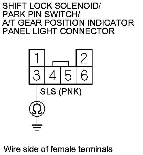 15. Check for continuity between shift lock solenoid/park pin switch/A/T gear position indicator panel light connector terminal No. 3 and body ground.
