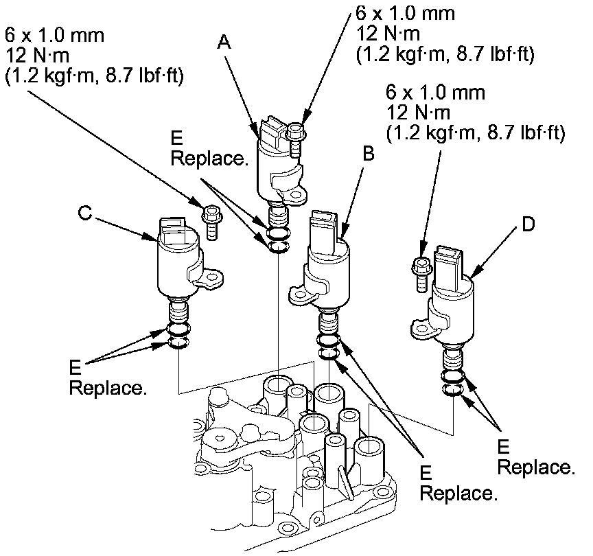 2. Install new O-rings (E) on each solenoid valve.