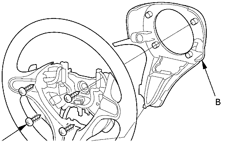 2. Remove the four screws (A) securing the steering wheel rear cover (B), then remove the steering wheel rear cover.
