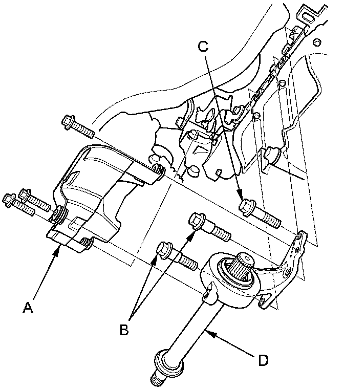 6. Remove the intermediate shaft (D) from the differential. Hold the intermediate shaft horizontally until it is clear of the differential to prevent damaging the oil seal.