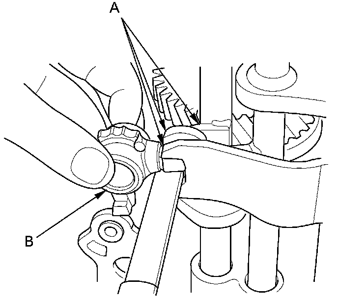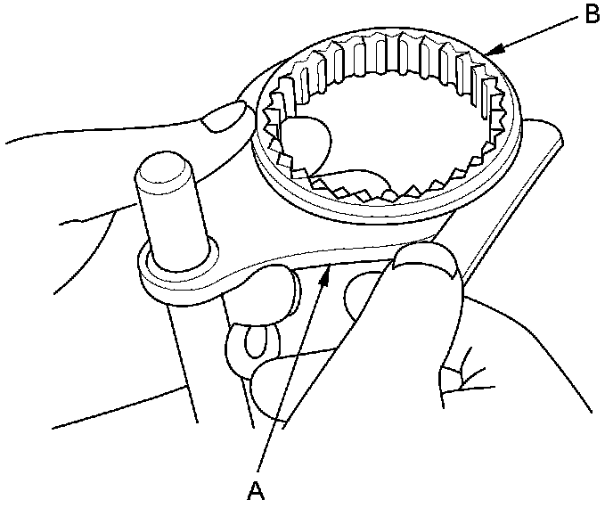 1. Measure the clearance between each shift fork (A) and its matching synchro sleeve (B). If the clearance exceeds the service limit, go to step 2.
