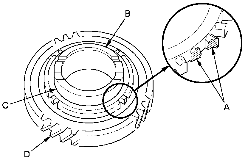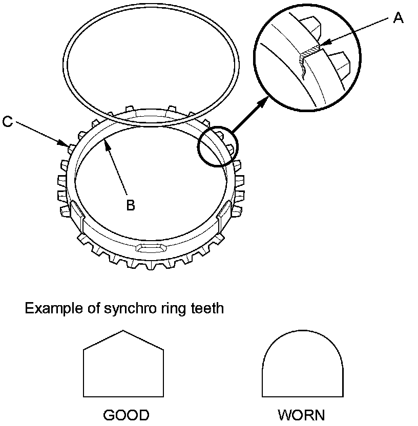 2. Inspect the inside of each synchro ring (B) for wear. Inspect the teeth (C) on each synchro ring for wear (rounded off).