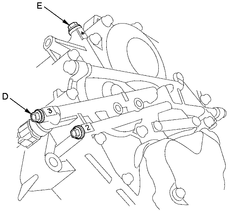 19. Connect the oil pressure gauge to the 3rd clutch pressure inspection port (D) and the 4th clutch pressure inspection port (E).