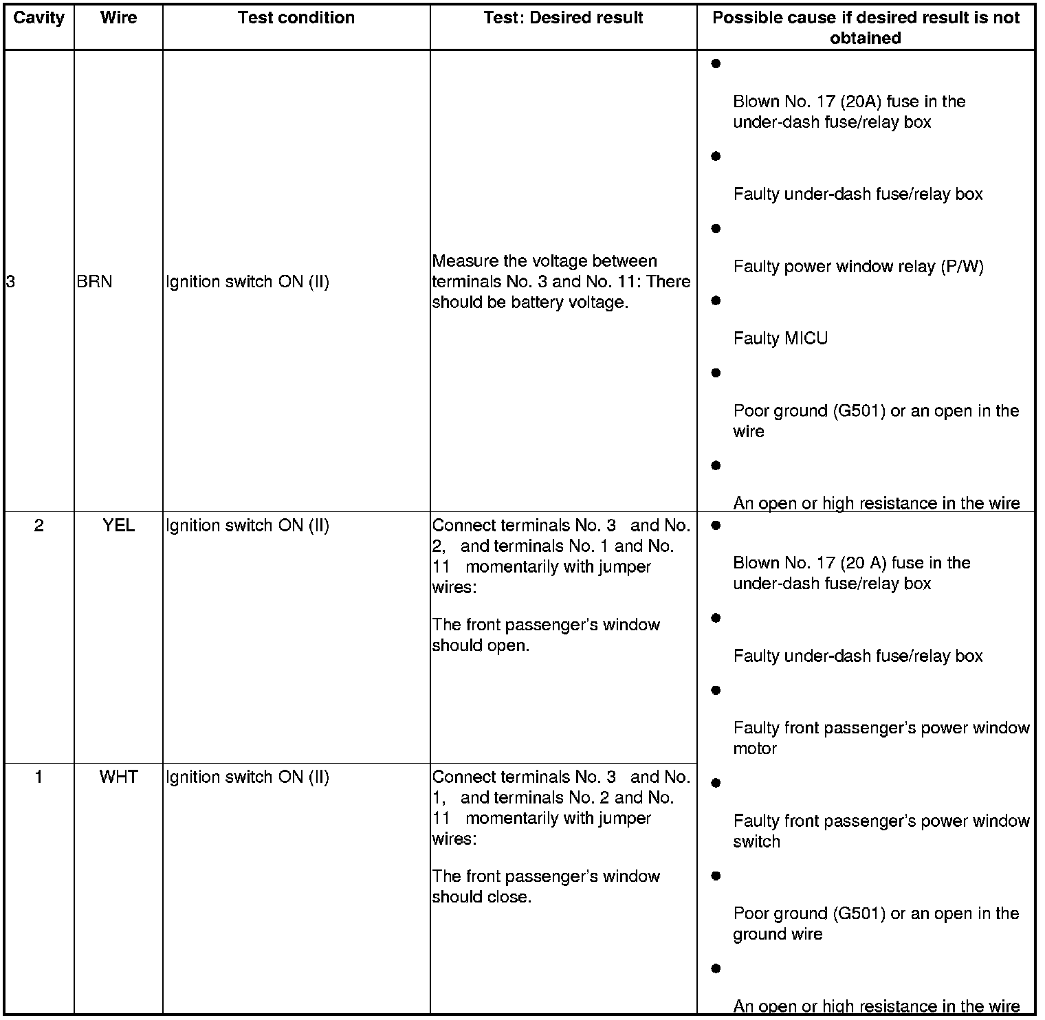 - If all the input tests prove OK, the control unit must be faulty; replace the power window master switch Power Window Master Switch Replacement.