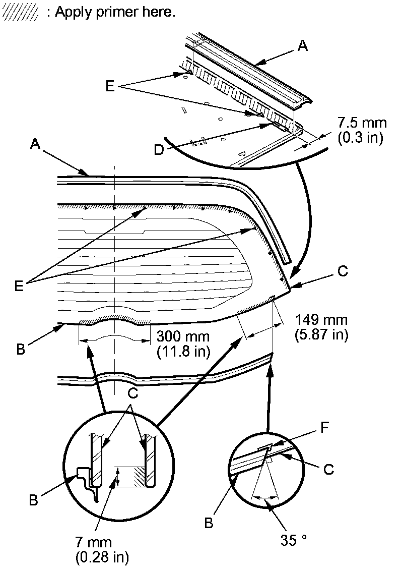 - Apply the glass primer to both side portions of the rear window, using the printed dots (C) on the rear window as a guide.