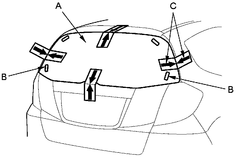 13. Attach fasteners A and B with adhesive tape to the inside face of the rear window (C) as shown.