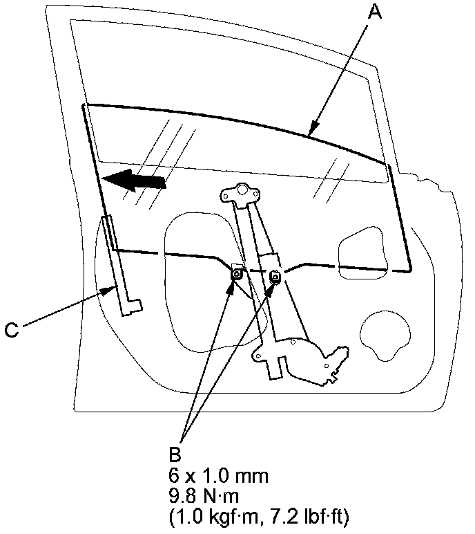 4. Push the glass against the channel (C), then tighten the glass mounting bolts.