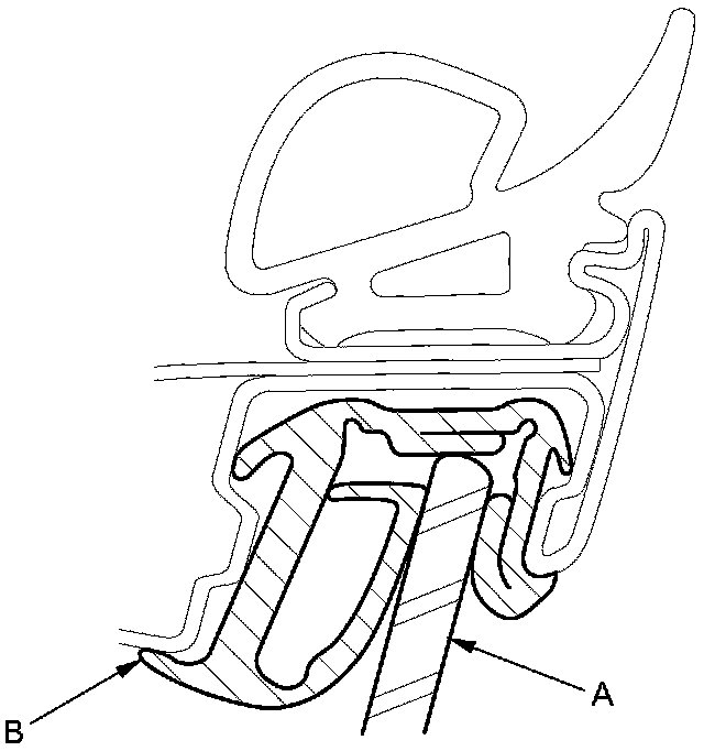 6. Raise the glass fully, and check for gaps. Also check that the glass (A) contacts the glass run channel (B) evenly.