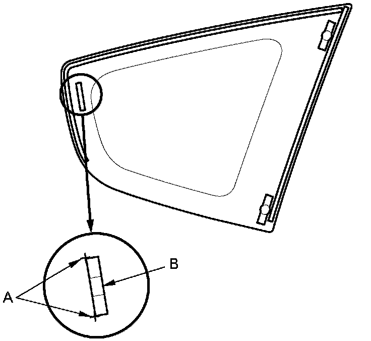 12. Apply a light coat of glass primer along the edge of the quarter glass (A) and rubber dams (B) as shown, then lightly wipe it off with gauze or cheesecloth: