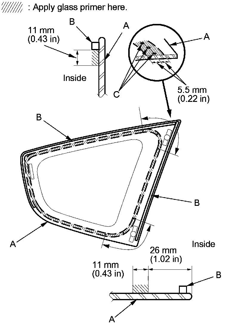 - Apply the glass primer to the corner portions of the quarter glass, using the printed dots (C) on the quarter glass as a guide.