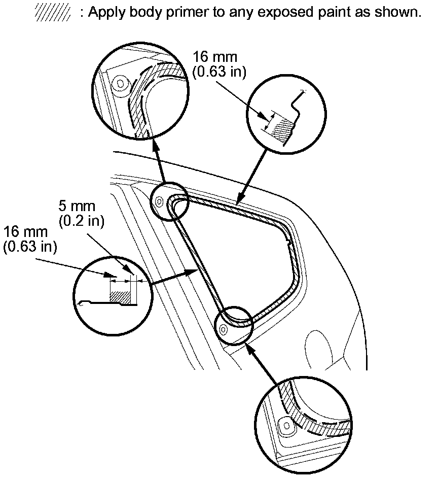 13. Apply a light coat of body primer to any exposed paint or metal around the flange where new adhesive will be applied. Let the body primer dry for at least 10 minutes: