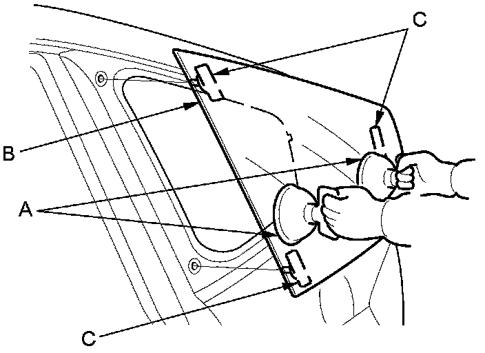 16. Use suction cups (A) to hold the quarter glass (B) over the opening, align it with the clips (C) and set it down on the adhesive. Lightly push on the quarter glass until its edges are fully seated on the adhesive all the way around.