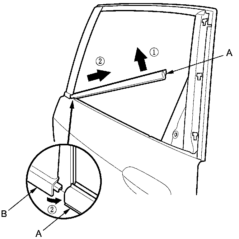 2. While lifting the rear of the door glass outer weatherstrip (A), slide the weatherstrip rearward to release the front edge of the weatherstrip from the door sash outer trim (B), then remove the weatherstrip.