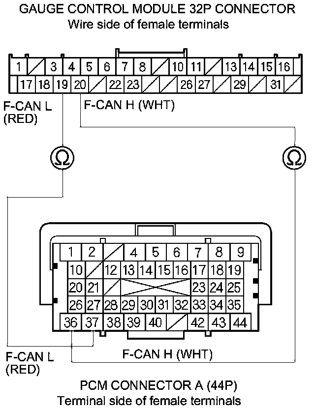 10. Check for continuity between gauge control module 32P connector terminals No. 20 and No. 19 and PCM connector terminals A (44P) terminals No. 36 and No. 37 respectively.