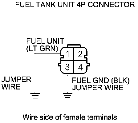 7. Connect fuel tank unit 4P connector terminals No. 1 and No. 3 and body ground with jumper wires.