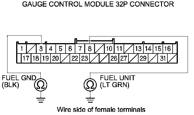 8. Check for continuity between body ground and gauge control module 32P connector terminals No. 3 and No. 8 individually.