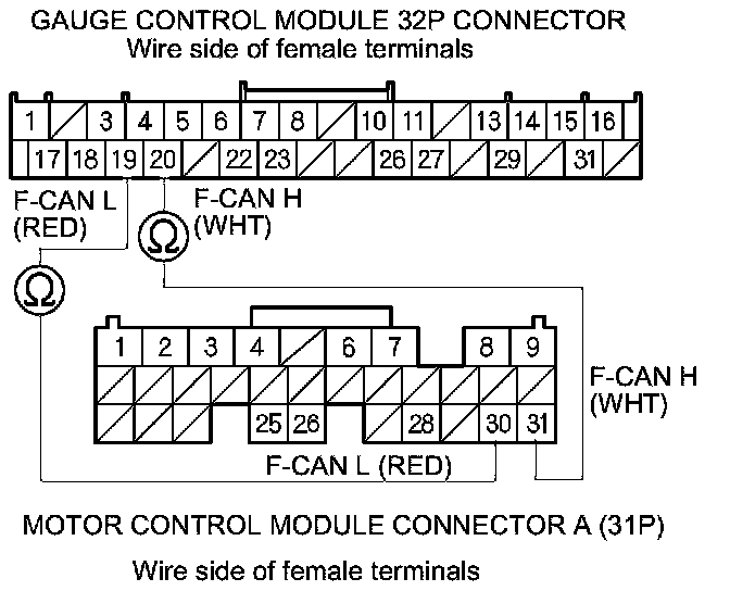 9. Check for continuity between gauge control module 32P connector terminals No. 20 and No. 19 and motor control module connector A (31P) terminals No. 31 and No. 30 respectively.