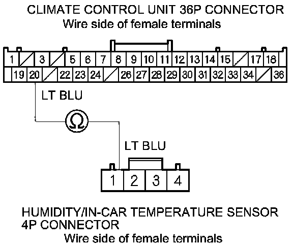 8. Check for continuity between climate control unit 36P connector terminal No. 20 and humidity/in-car temperature sensor 4P connector terminal No. 1.