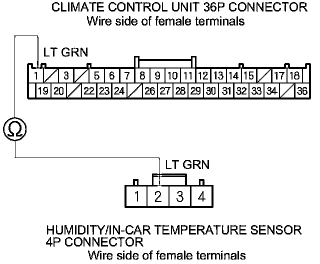 9. Check for continuity between climate control unit 36P connector terminal No. 1 and humidity/in-car temperature sensor 4P connector terminal No. 2.