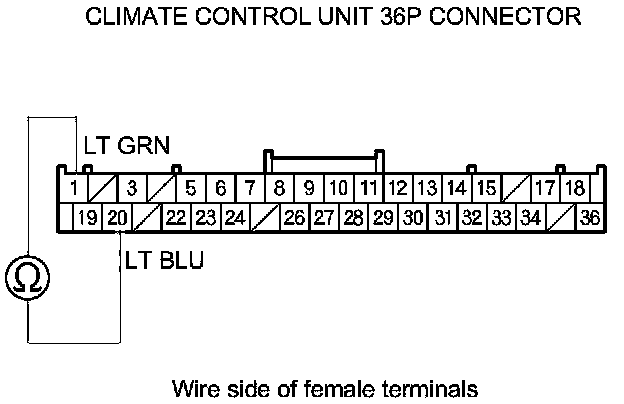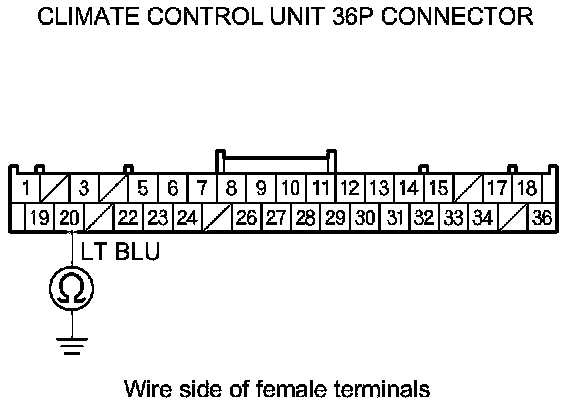 9. Check for continuity between climate control unit 36P connector terminals No. 1 and No. 20.