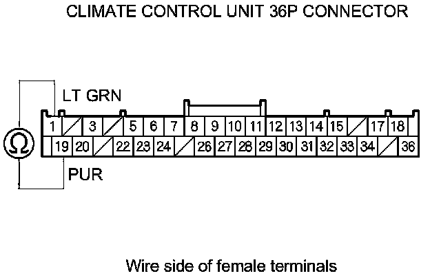 9. Check for continuity between climate control unit 36P connector terminals No. 1 and No. 19.