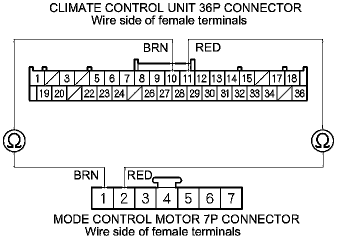 9. Check for continuity between the following terminals of the climate control unit 36P connector and the mode control motor 7P connector.