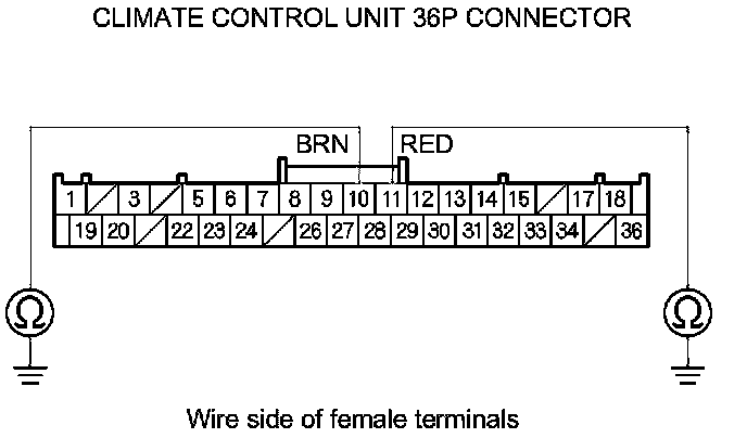 10. Check for continuity between body ground and climate control unit 36P connector terminals No. 10 and No. 11 individually.