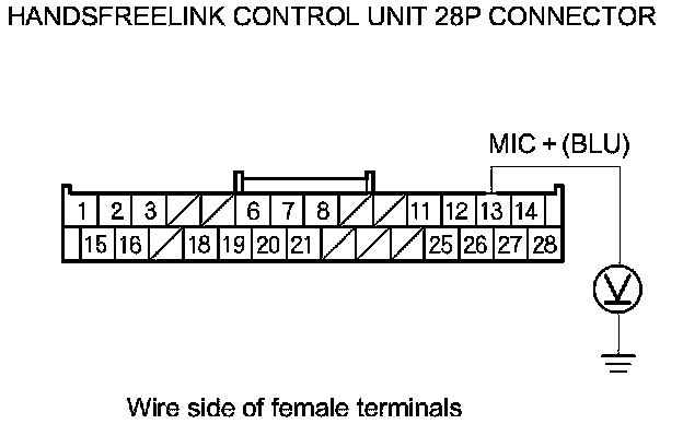 9. Measure the voltage between HandsFreeLink control unit 28P connector terminal No. 13 and body ground.