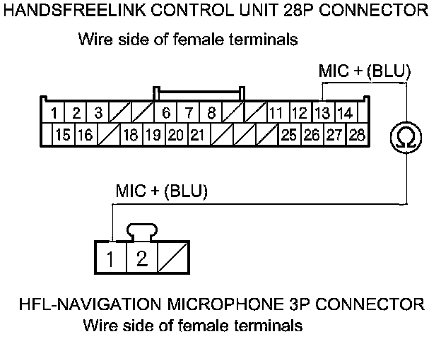 11. Check for continuity between HandsFreeLink control unit 28P connector terminal No. 13 and HFL-navigation microphone 3P connector terminal No. 1.