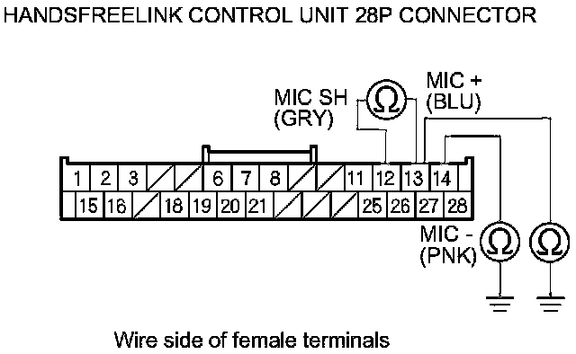 8. Check for continuity between body ground and HandsFreeLink control unit 28P connector terminals No. 13 and No. 14 individually, then between terminals No. 12 and No. 13.