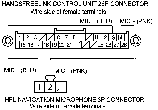 9. Check for continuity between HandsFreeLink control unit 28P connector terminals No. 13 and No. 14 and HFL-navigation microphone 3P connector terminals No. 1 and No. 2 respectively.