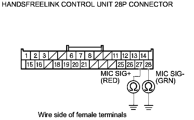 11. Check for continuity between body ground and HandsFreeLink control unit 28P connector terminals No. 27 and No. 28 individually.