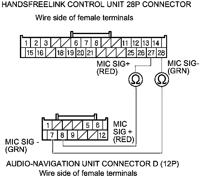 12. Check for continuity between HandsFreeLink control unit 28P connector terminals No. 27 and No. 28 and audio-navigation unit connector D (12P) terminals No. 8 and No. 7 respectively.