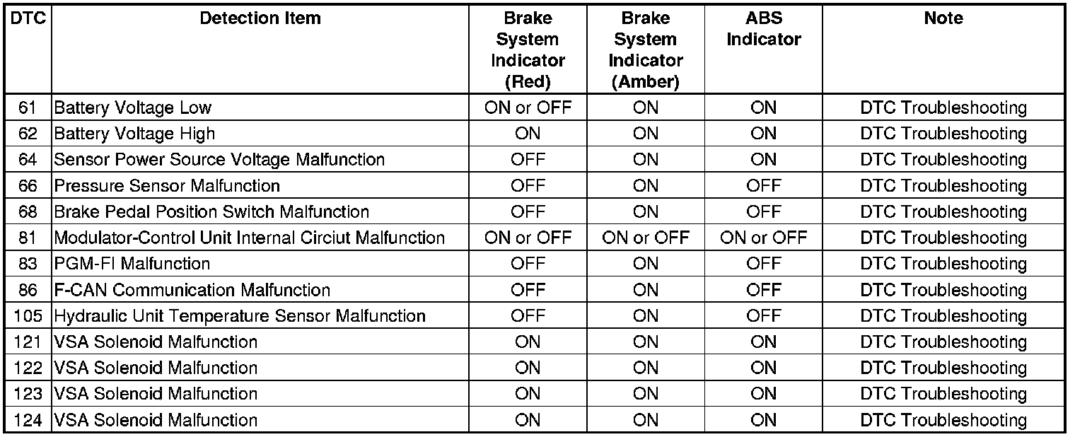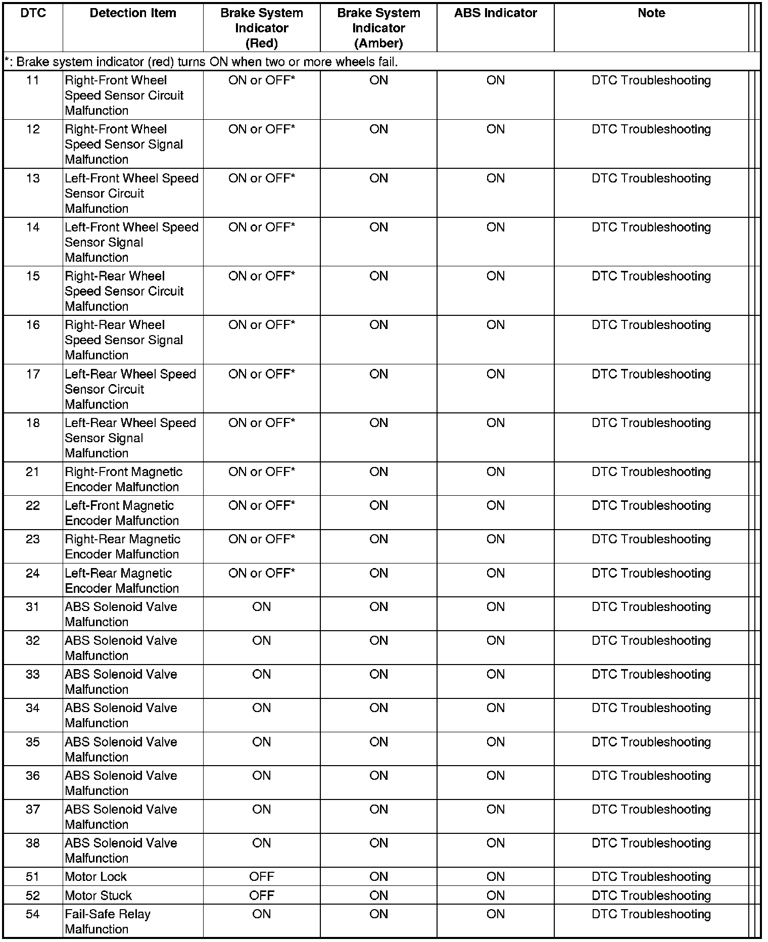 ABS Components DTC Troubleshooting Index