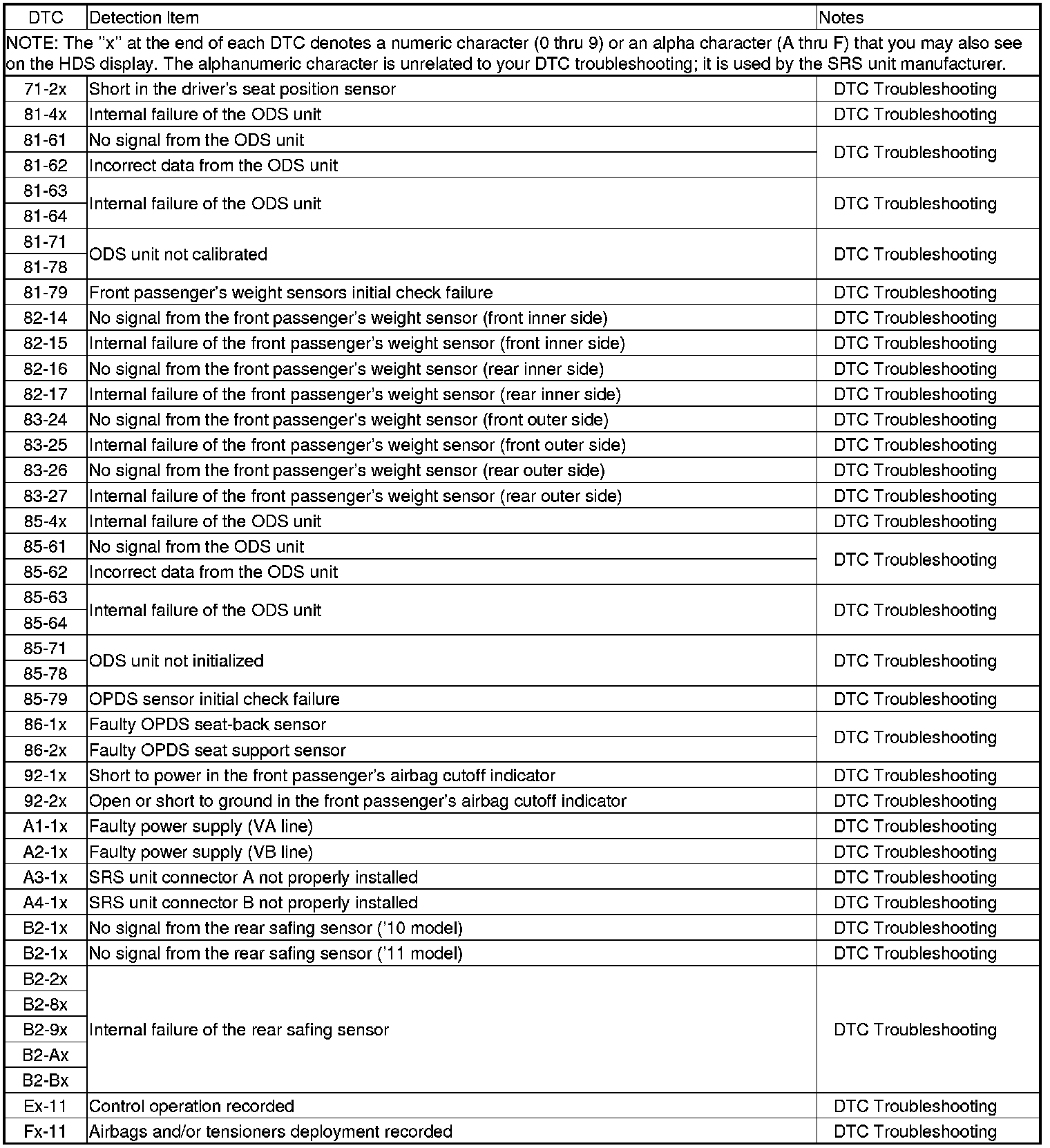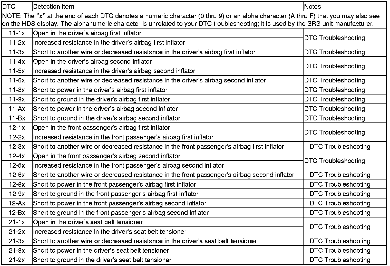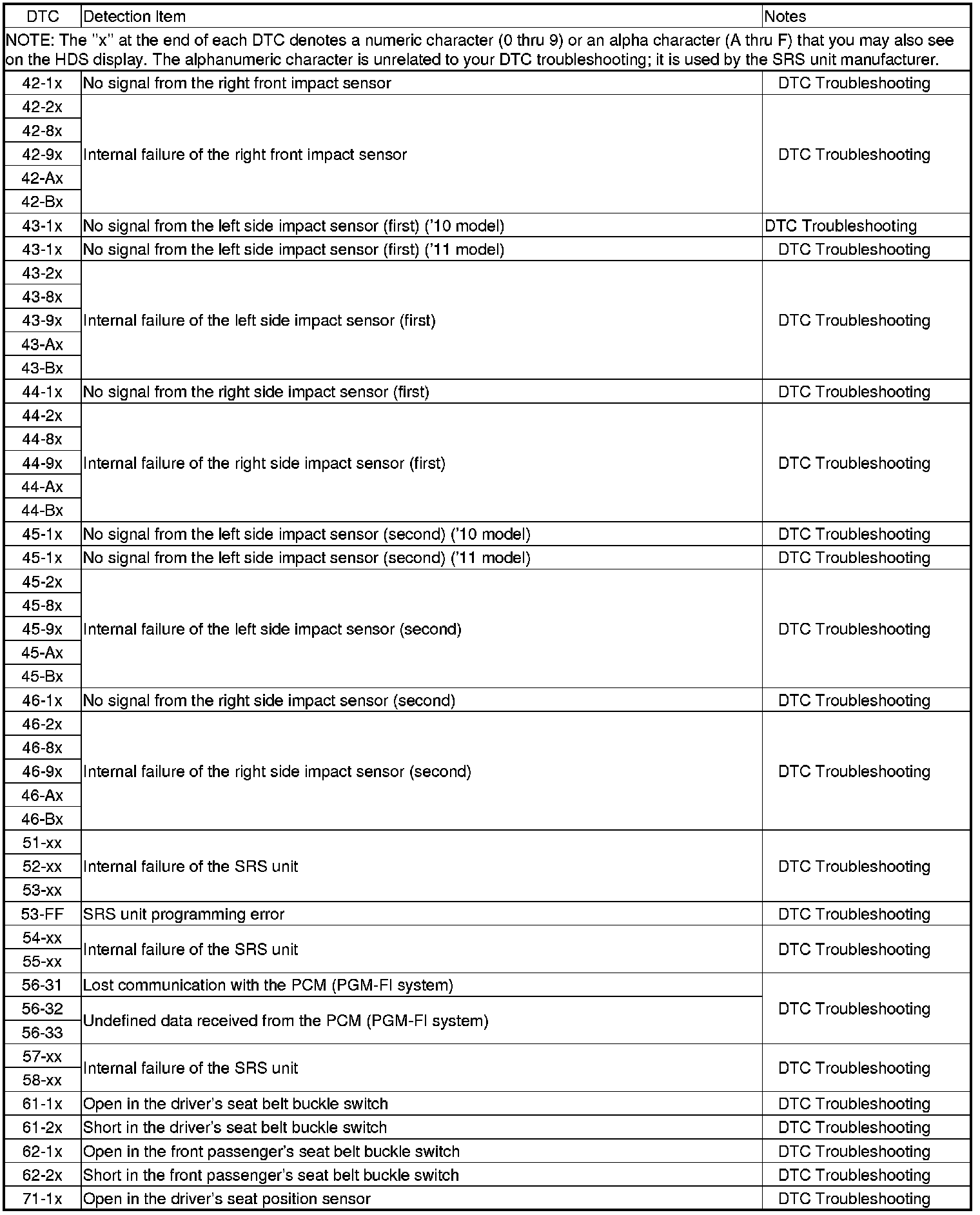 SRS DTC Troubleshooting Index