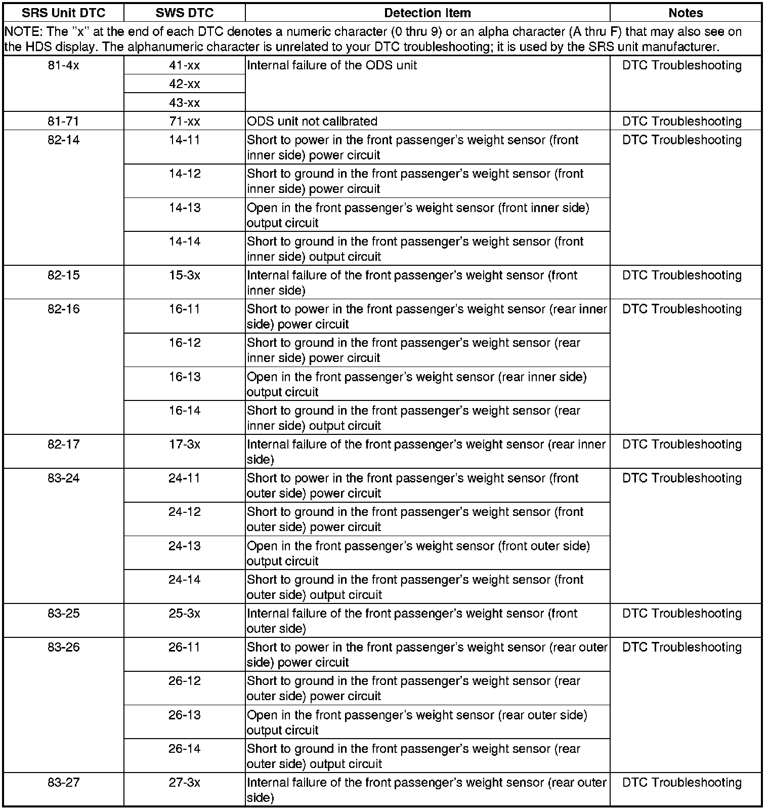 Only read DTCs from the SRS menu, not from SWS menus unless instructed to check SWS DTCs. SWS (ODS unit) DTCs are subcodes of SRS unit DTCs. Only troubleshoot the corresponding SRS DTCs. Also these SWS DTCs are cleared by turning the ignition switch to LOCK (0).