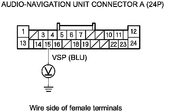 11. Check for continuity between audio-navigation unit connector A (24P) terminal No. 15 and PCM connector A (49P) terminal No. 29.