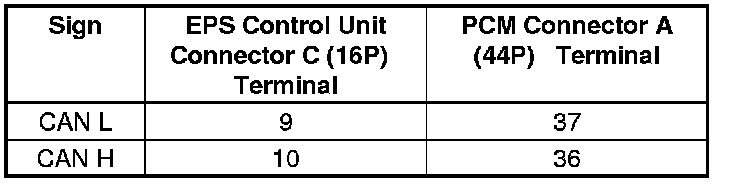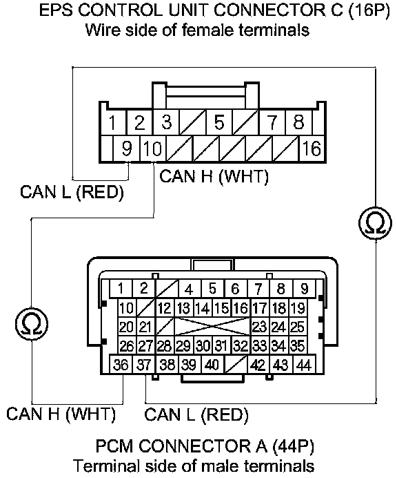 11. Check for continuity between the EPS control unit connector C (16P) terminals and the PCM connector A (44P) terminals individually.