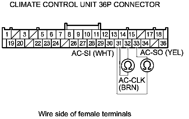 13. Check for continuity between climate control unit 36P connector terminals No. 31 and No. 32, and between terminals No. 31 and No. 33.