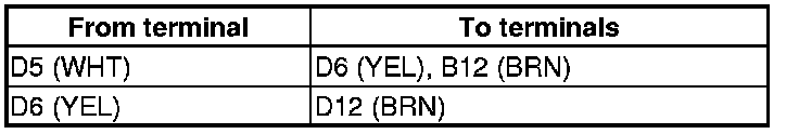 16. Check for continuity between body ground and audio-navigation unit connector D (12P) terminals No. 5,No. 6, and No. 12 individually.