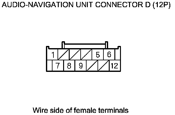 15. Check for continuity between the terminals of audio-navigation unit connector D (12P) according to the table.