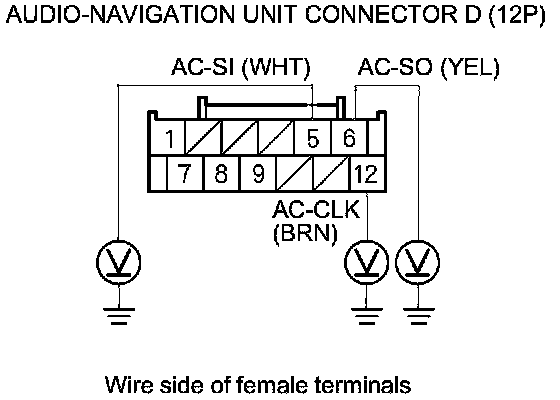 18. Measure the voltage between body ground and audio-navigation unit connector D (12P) terminals No. 5,No. 6, and No. 12 individually.