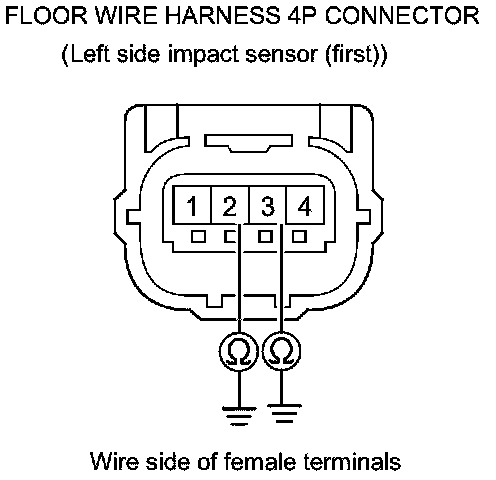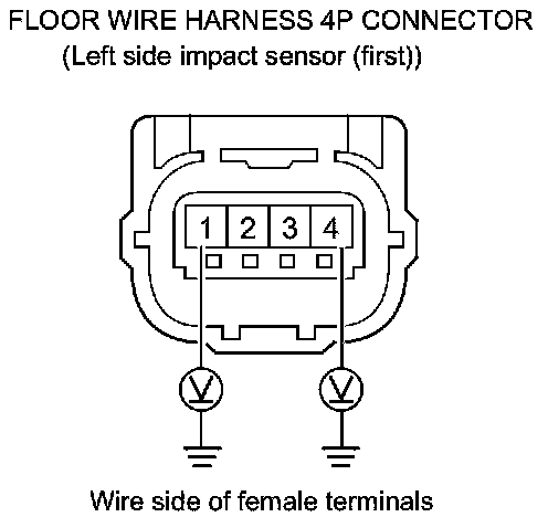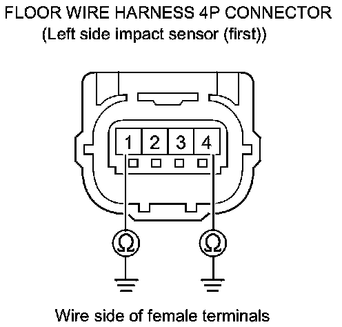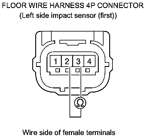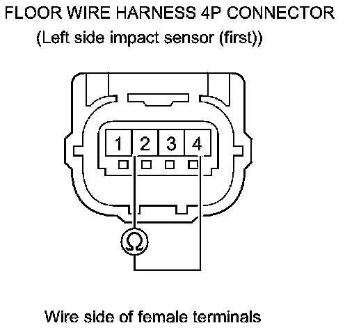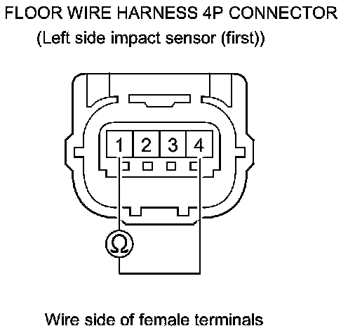 34. Measure the resistance between the floor wire harness 4P connector (left side impact sensor (first)) terminals No. 1 and No. 4. There should be an open circuit or at least 1 MOhms.