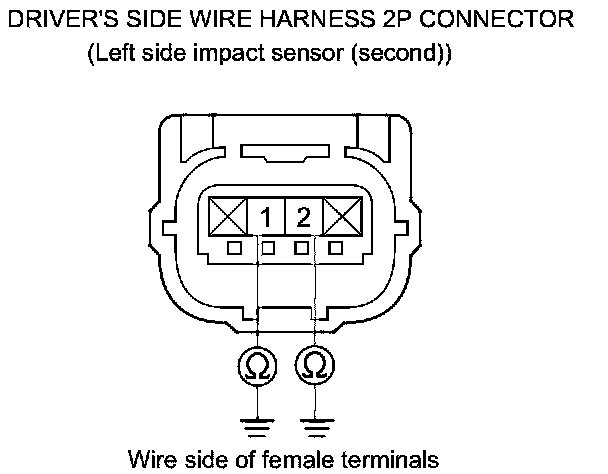 38. Measure the resistance between body ground and the driver's side wire harness 2P connector (left side impact sensor (second)) terminals No. 1 and No. 2, individually. There should be an open circuit or at least 1 MOhms.