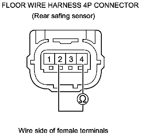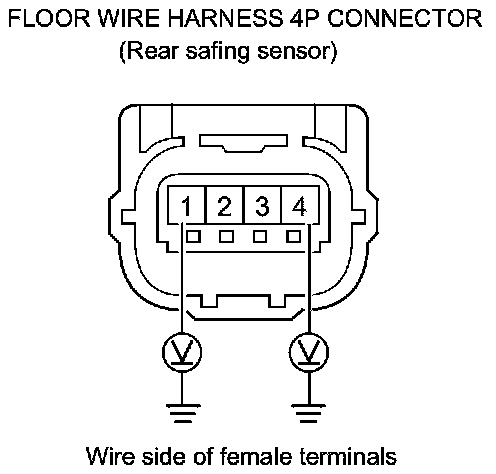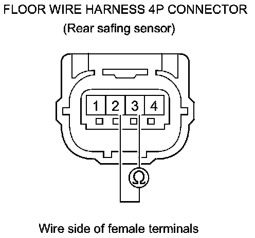91. Measure the resistance between the floor wire harness 4P connector (rear safing sensor) terminals No. 2 and No. 4. There should be an open circuit or at least 1 MOhms.