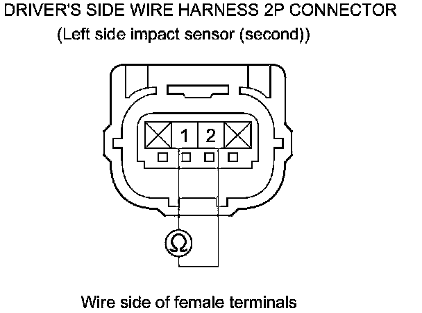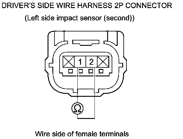62. Measure the resistance between the driver's side wire harness 2P connector (left side impact sensor (second)) terminals No. 1 and No. 2. There should be an open circuit or at least 1 MOhms.