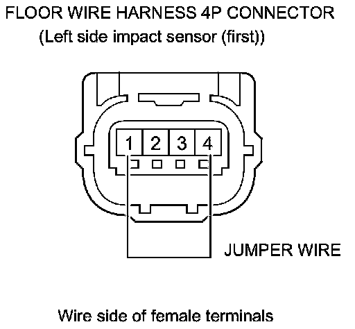 67. Install a jumper wire between floor wire harness 4P connector (left side impact sensor (first)) terminals No. 1 and No. 4.