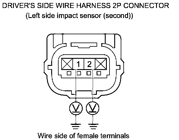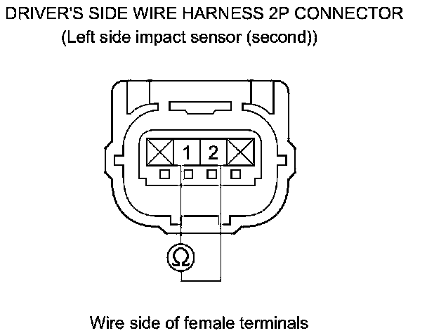39. Measure the resistance between the driver's side wire harness 2P connector (left side impact sensor (second)) terminals No. 1 and No. 2. There should be an open circuit or at least 1 MOhms.