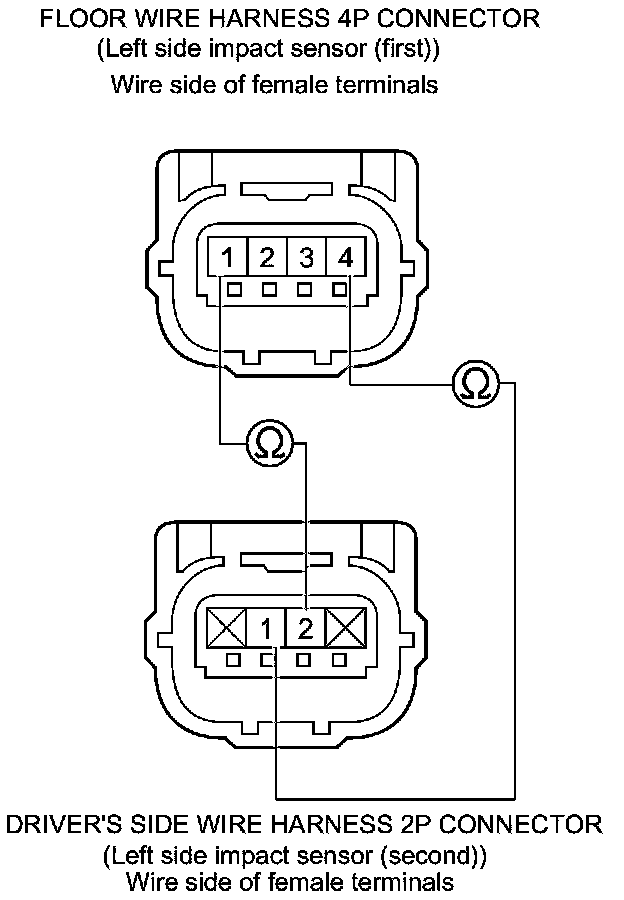 45. Measure the resistance between the floor wire harness 4P connector (left side impact sensor (first)) terminal No. 1 and the driver's side wire harness 2P connector (left side impact sensor (second)) terminal No. 2, and between the floor wire harness 4P connector (left side impact sensor (first)) terminal No. 4 and the driver's side wire harness 2P connector (left side impact sensor (second)) terminal No. 1. There should be less than 1.0 Ohms.