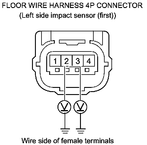 66. Measure the voltage between body ground and the floor wire harness 4P connector (left side impact sensor (first)) terminals No. 2 and No. 3 individually. There should be less than 0.2 V.
